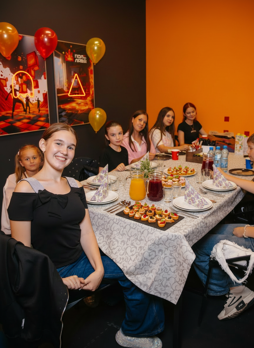 Отдельный стол, украшения, возможность принести торт и угощения. Родители могут посидеть, пообщаться и наблюдать за детьми.